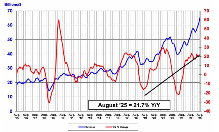Brancheorganisationen Semiconductor Industry Association (SIA) fortæller, at det globale halvledersalg var på 64,9 milliarder dollars i august 2025, en stigning på 21,7 % sammenlignet med det samlede salg på 53,3 milliarder dollars i august 2024 og 4,4 % mere end det samlede salg på 62,1 milliarder dollars i juli 2025. Det månedlige salg er udarbejdet af World Semiconductor Trade Statistics (WSTS) og repræsenterer et tremåneders glidende gennemsnit. SIA repræsenterer 99 % af den amerikanske halvlederindustri målt på omsætning og næsten to tredjedele af ikke-amerikanske chipvirksomheder.