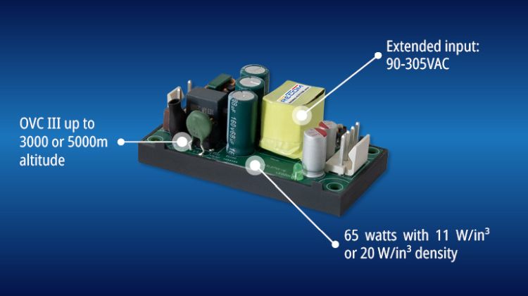AC/DC-modulet tåler et udvidet universelt indgangsområde på 85 – 305VAC og er klassificeret til overspændingskategori III (OVC III) op til 3.000m højde (open-frame) og op til 5.000m i de indkapslede varianter (OVC II). Effektiviteten topper ved over 90% og opretholdes ned til 10% belastning, mens strømforbruget uden belastning typisk er mindre end 100mW. Versioner med faste udgange på 5V, 12V, 15V, 24V, 36V eller 52V (DC) er tilgængelige, alle med fuld kortslutnings-, overspændings- og overstrømsbeskyttelse.
