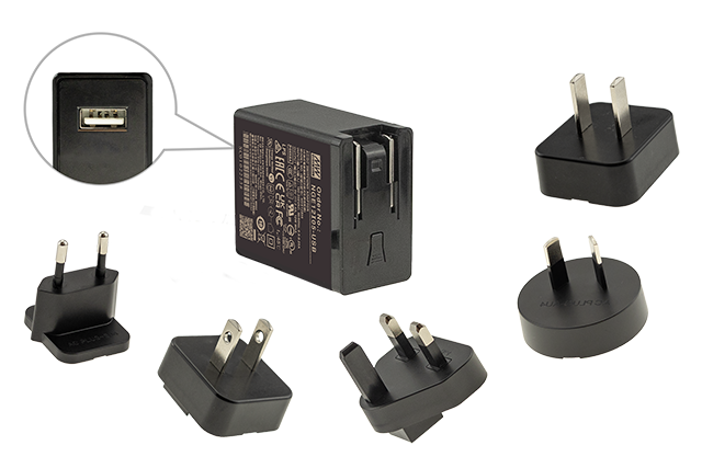 Den ultratynde vægmonterbare AC/DC-adapter leveres med fem nemt udskiftelige stik (Europa, USA, U.K, Australien og Kina).