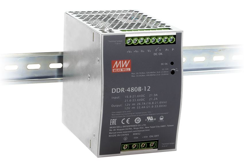 DDR-480 serien er en smal (85.5mm) 480W DIN Skinne DC/DC konverter fra MEAN WELL.