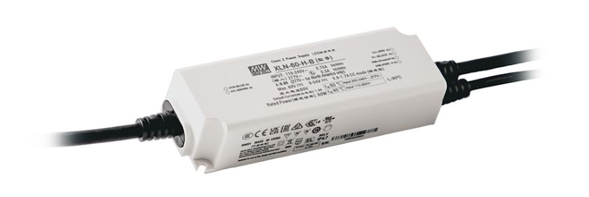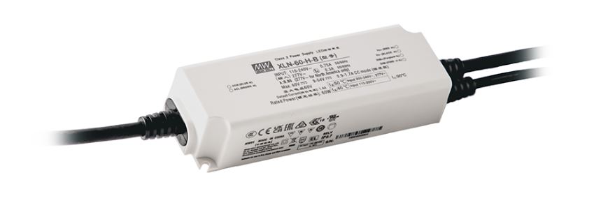 60W har en indgangsspænding på 110-305VAC og forhandles i 12V, 24V, 48V samt H-typen. Udgangsstrømmen kan justeres fra 900mA til 1700mA med NFC. Effektiviteten på XLN-serien i 60W er op til 90 procent.