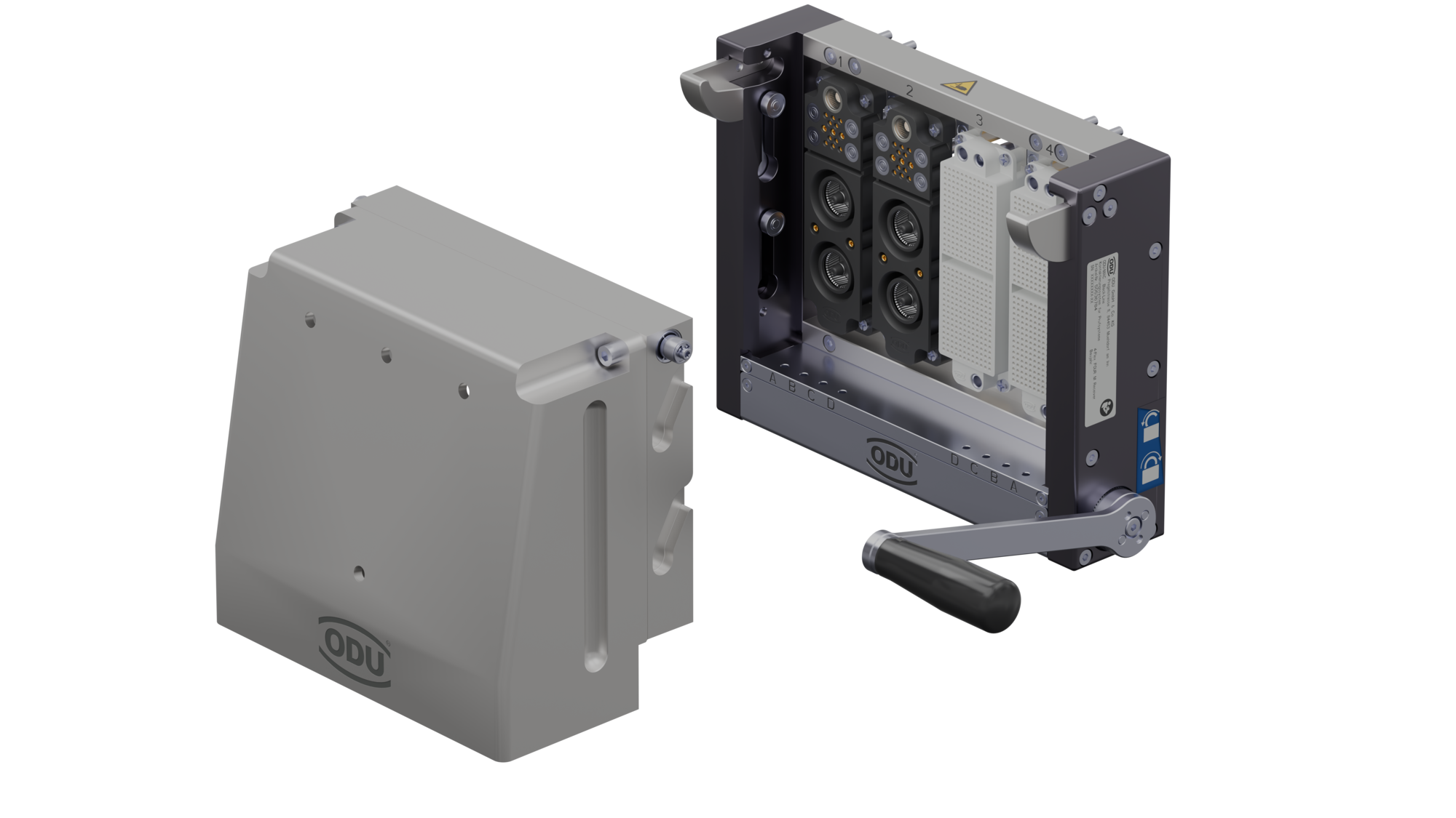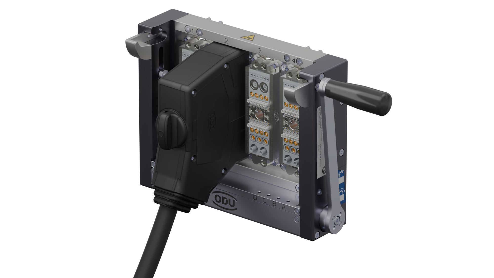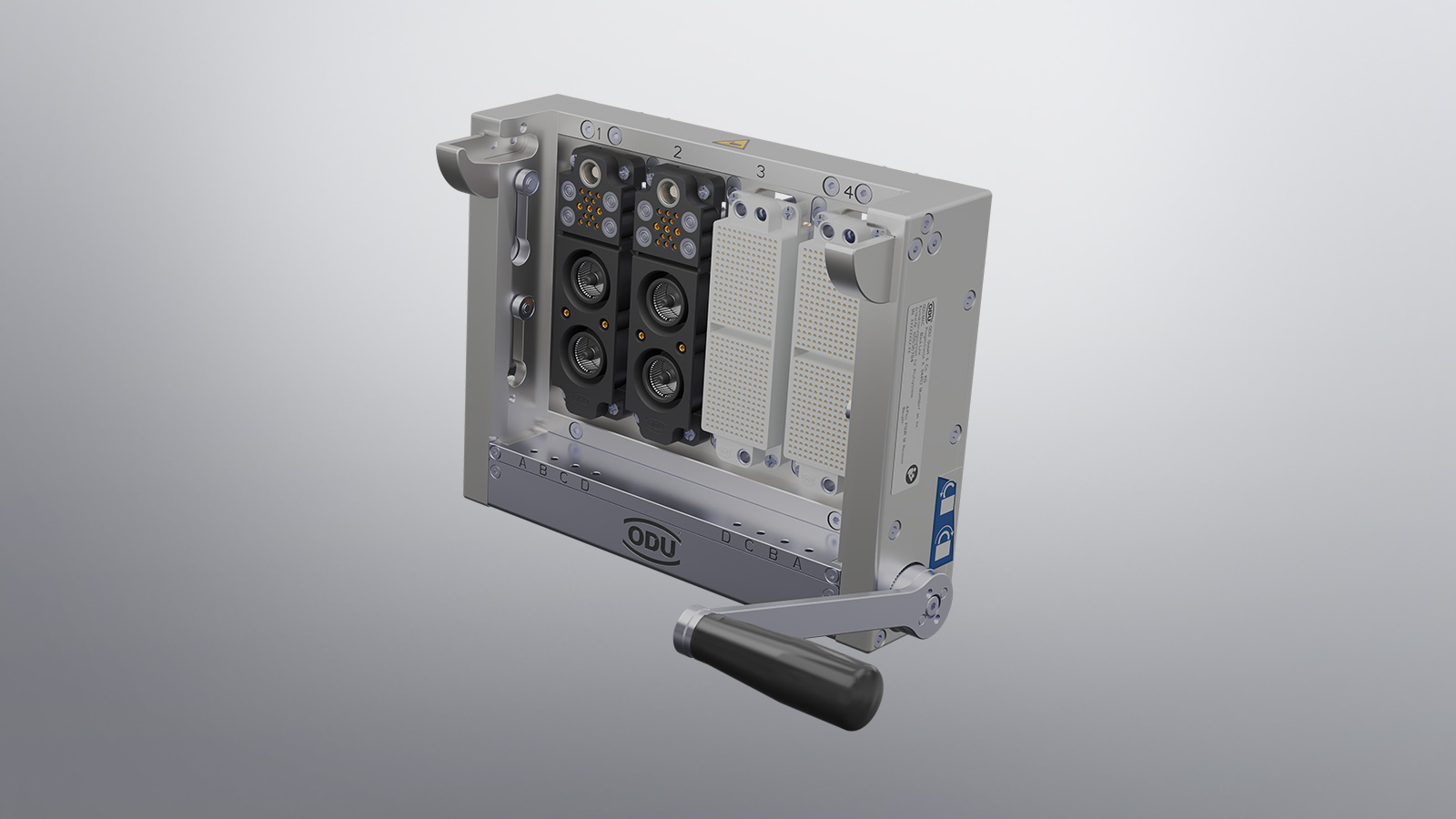 En tredje mulighed er at anvende fire ODU-MAC® Rapid-stik med overførselsmoduler. Rapid-seriens er designet med et praktisk halvskals-princip, der letter monteringen. Det velkendte spindellåsesystem giver både taktil og akustisk feedback, når stikket er låst korrekt.