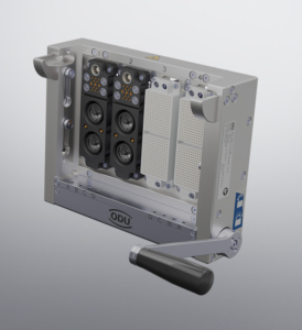 Housing muligheden kan bruges som et “stort stik”. Det robuste aluminiumshus er udstyret med ergonomiske håndtag, som man lukker hele interfacet med – effektivt og sikkert.