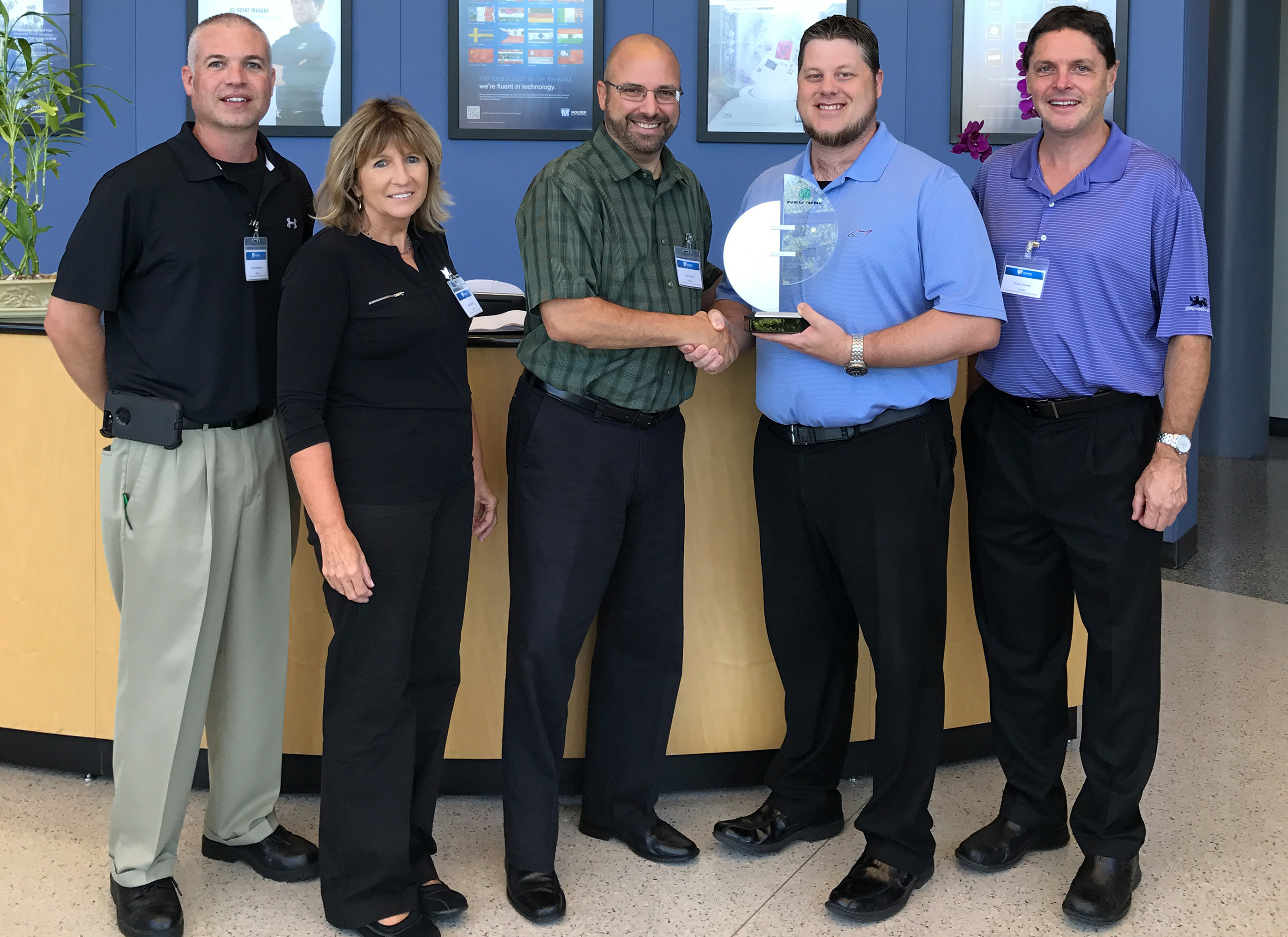 Mouser’s Les Balamut receives the Supplier Manager Excellence Award for Lifetime Outstanding Support. Pictured left to right are Patrick Newsome, Warehouse Manager, Neutrik USA; Ingrid Shytle, Supply Chain Manager, Neutrik USA; Tom Chudyk, Director of Sales, Neutrik USA; Les Balamut, Director of Supplier Management, Mouser Electronics; and Bryan Sherrel, Finance Director, Neutrik USA.