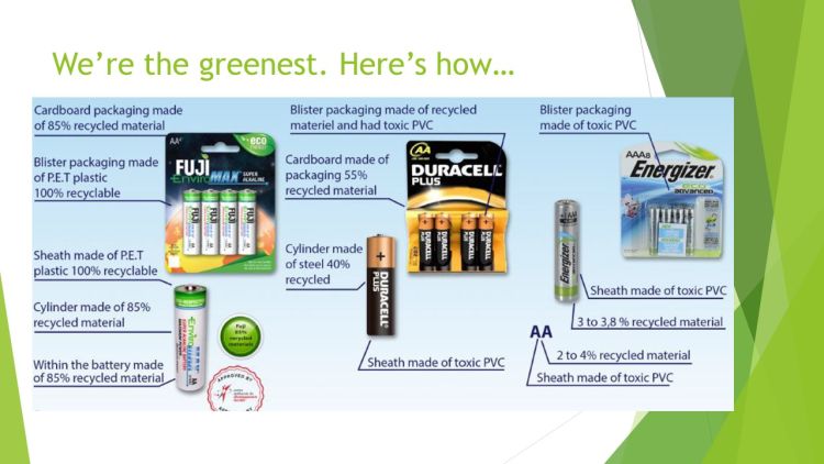 En af verdens største producenter af batterier er gået hele vejen af hensyn til miljøet – fra produktion til materialer og emballage – med Fuji EnviroMAX der er produceret af mere end 85% recycling-materiale og fuldstændig fri for PVC, kviksølv og cadmium.