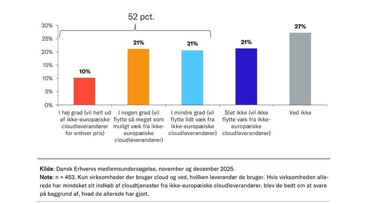 10 pct. af de danske virksomheder ønsker i høj grad at reducere deres brug af ikke-europæiske cloudleverandører, mens 21 pct. i nogen grad ønsker at reducere ikke-europæiske leverandører. Endelig ønsker også 21. pct. i mindre grad at reducere brugen af ikke-europæisk cloud.