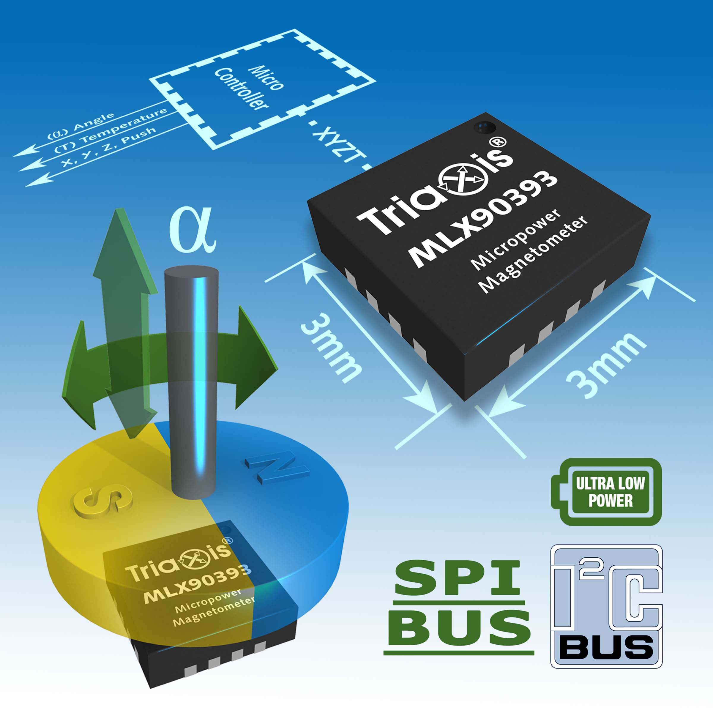 Melexis introducerer en ny, fuldt programmerbar og ekstremt kompakt sensor-IC, der meget præcist kan måle ændringer i magnetisk flux-densitet langs X-, Y- og Z-akserne. MLX90393 er baseret på virksomhedens egen Triaxis® teknologi og giver et nærmest ubegrænset antal muligheder inden for design af alle slags HMI-implementeringer (human machine interface) fra joysticks og skydere over push-/pull-kontakter, niveaureguleringer, lineære swipe-switche og drejeknapper til kompleks 3D-positionssensorer. IC trækker kun 2,5µA i tomgang og er derfor oplagt til mikroeffektapplikationer. Kredsen anvender et monolitisk pixel-celle arrangement og har et output med en 16-bits opløsning.