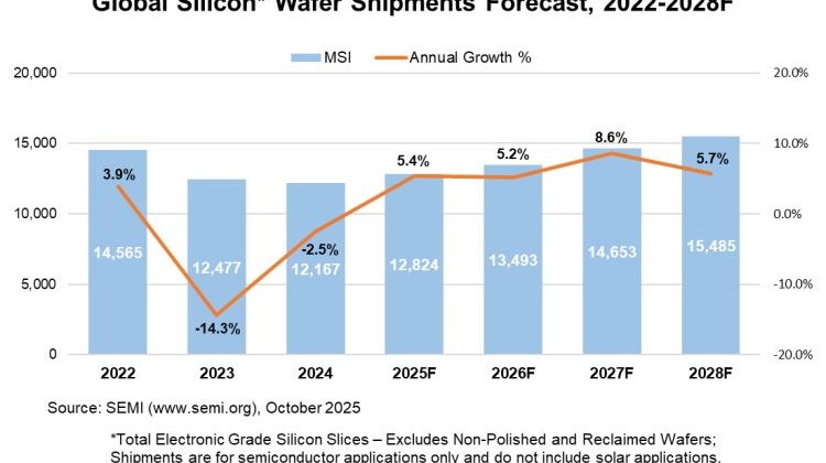 De globale leverancer af silicium-wafers forventes at stige med 5,4 % i 2025 til 12.824 millioner kvadrattommer (MSI) efterfulgt af stabil vækst frem til 2028,