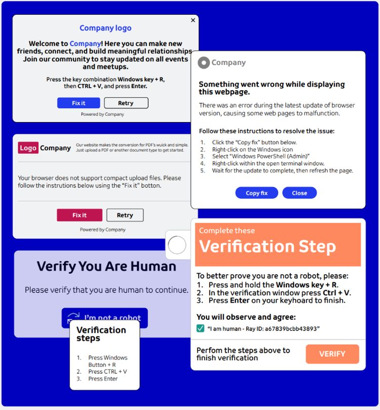 Det særlige ved ClickFix-angreb er, at de ofte starter på hjemmesider, der fremstår legitime –enten som kompromitterede sider eller som overbevisende kopier af kendte og troværdige sites og programmer. Når brugeren selv udfører handlinger, der ligner almindelig fejlfinding eller opdatering, fremstår aktiviteten legitim og bliver derfor sjældent opdaget af traditionelle sikkerhedsløsninger.