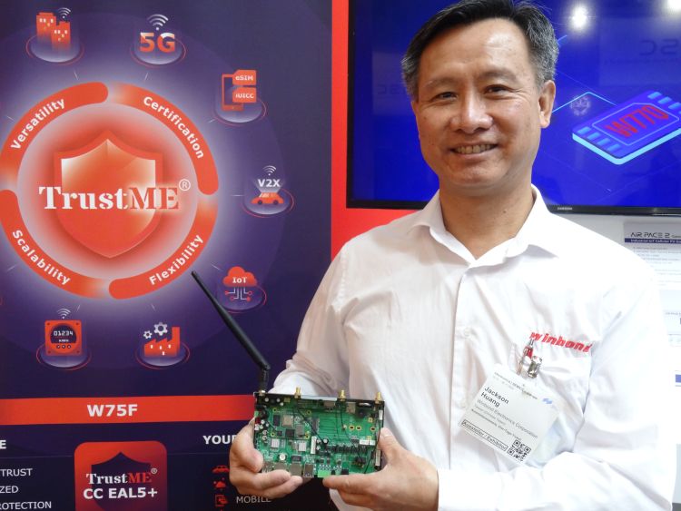 Jackson Huang med et board, der er loddet ved 190°C. Alle Winbonds flash-produkter – også dem til root-of-trust applikationer – kan loddes ved en temperatur, der kan spare 57 tons CO2 pr. montagelinje – og det kan man stole på!