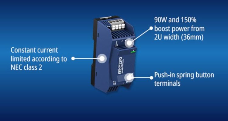 Recoms nye REFIN2U-S90/24/CL DIN-skinne AC/DC-forsyning leverer nominelt 90W med en boost-kapacitet på 150 % i 4,5 sekunder for at give mulighed for overspændingsbelastninger. Indgangsspændingsområdet er universelt 85-276 VAC, nominel overspændingskategori II (OVC II) op til 5.000m højde, mens udgangen er nominel 24VDC, justerbar til 29VDC. Udgangen har en konstant strømkarakteristik ved overbelastning og er klassificeret som LPS, NEC klasse 2 i henhold til UL1310. Delene fungerer i omgivelsestemperaturer fra -40 °C til +70 °C, og en pålidelig effektivitet på 93,6 % bidrager til kølig drift og lange MTBF/levetidsvurderinger.